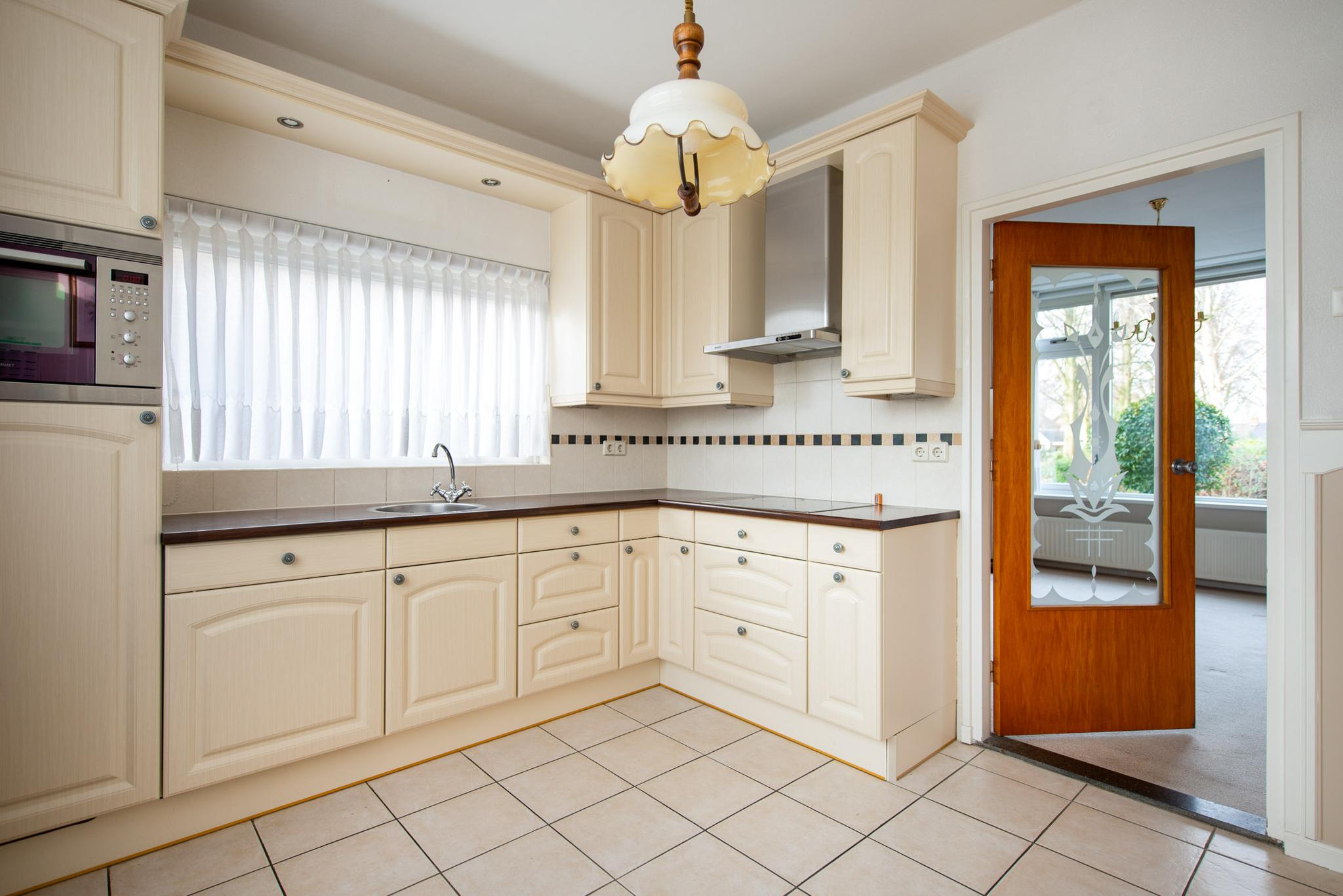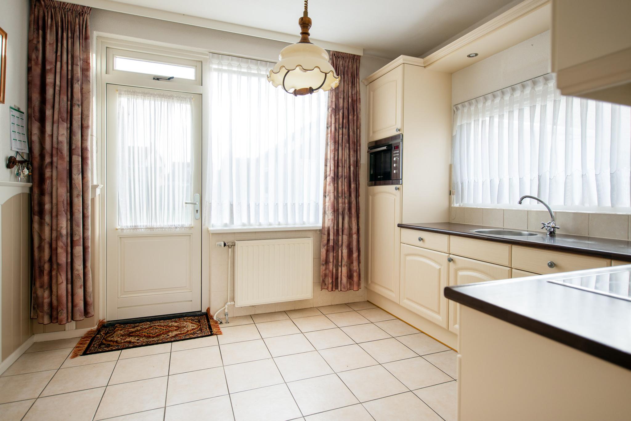 Mooie woonkeuken met tuindeur en keurige L-vormige inrichting voorzien van diverse inbouwapparatuur.