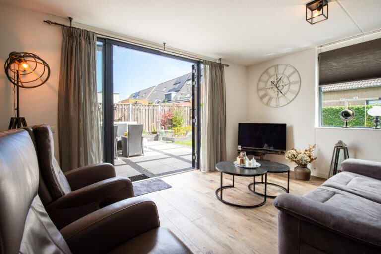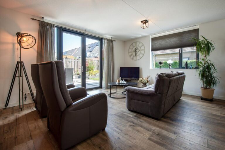 Ruime woonkamer met airco en tuindeuren, moderne tegelvloer en lichte wand- en plafondafwerking.