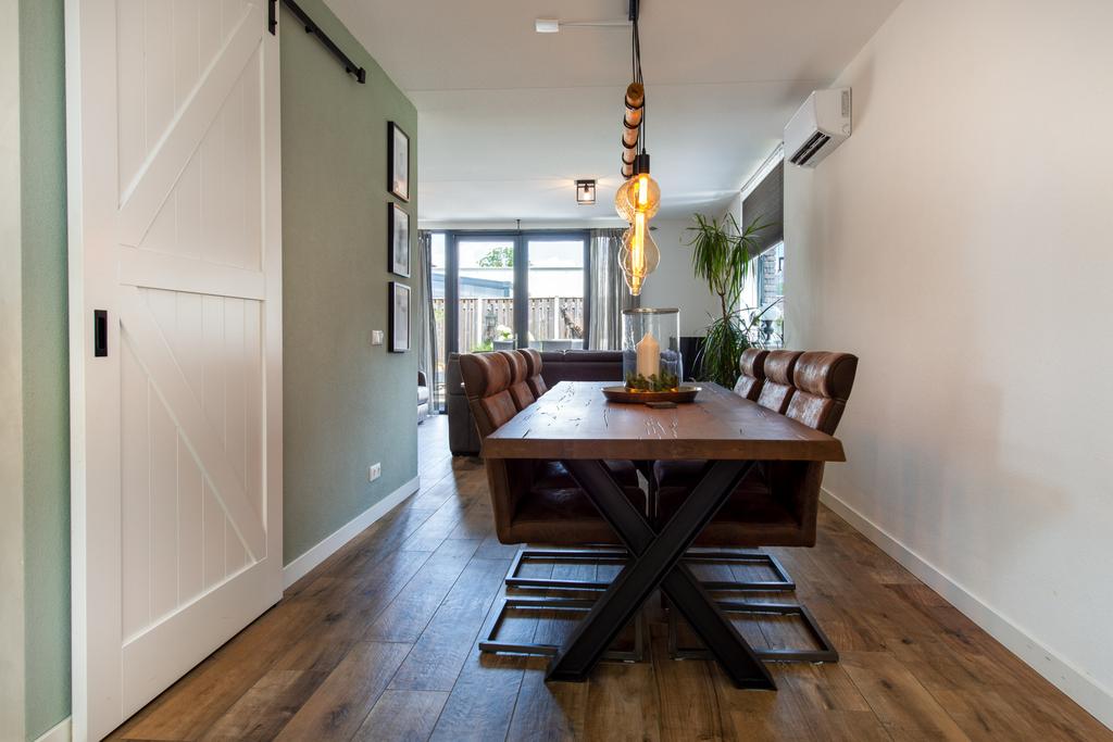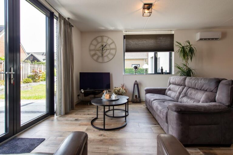 Ruime woonkamer met airco en tuindeuren, moderne tegelvloer en lichte wand- en plafondafwerking.