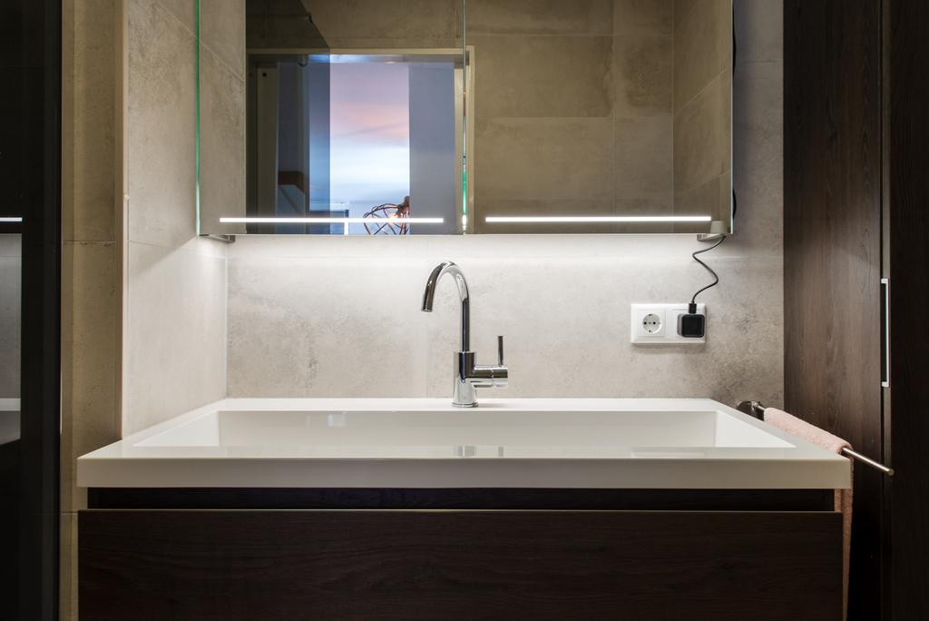 Luxe uitgevoerde toiletruimte met wandcloset en fonteintje.