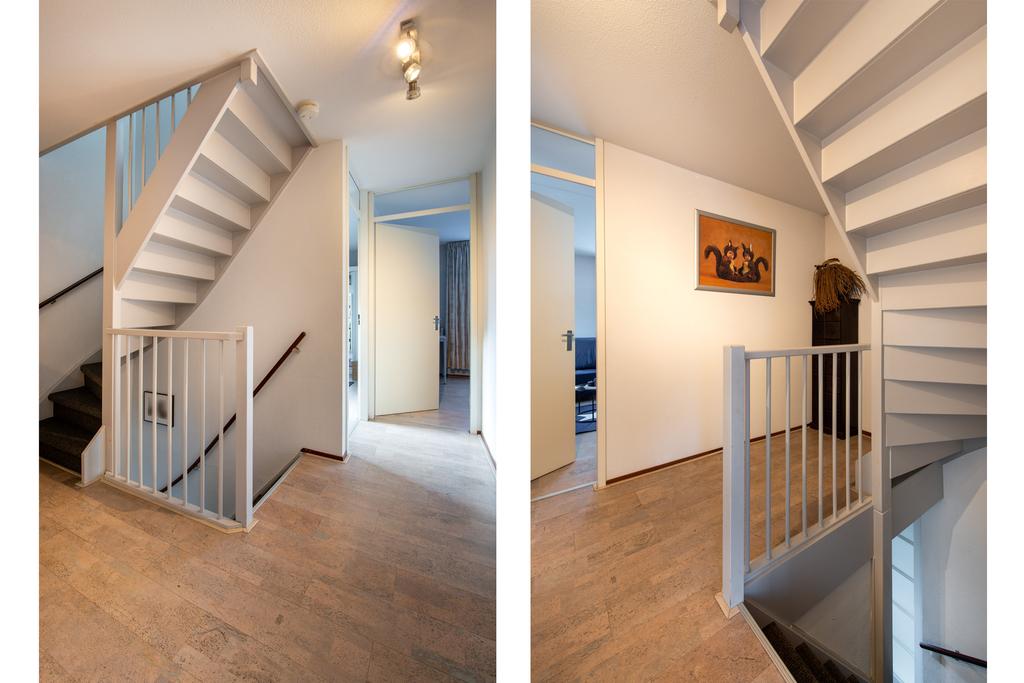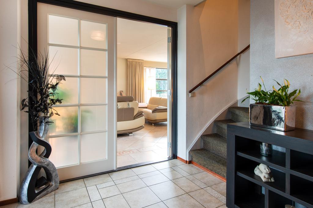 Ruime hal en binnenkomst met trapopgang en garderobe, tegelvloer, uitgebreide meterkast en dubbele deur naar woonkamer.