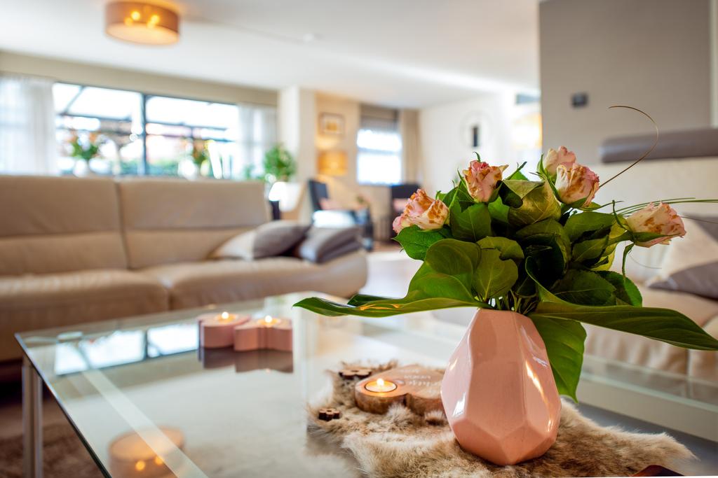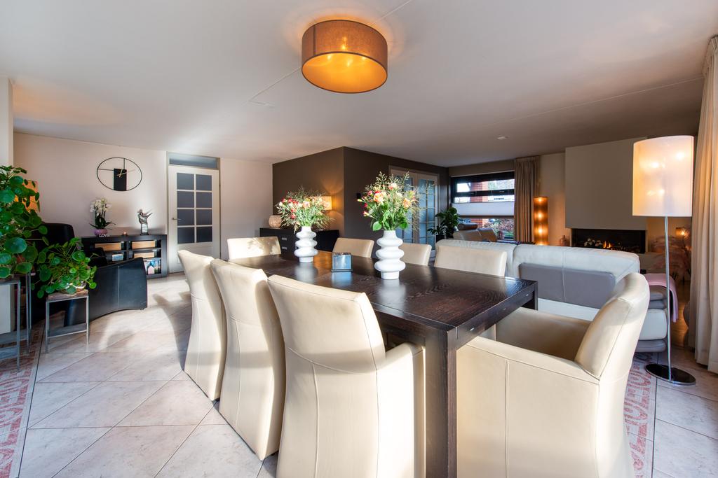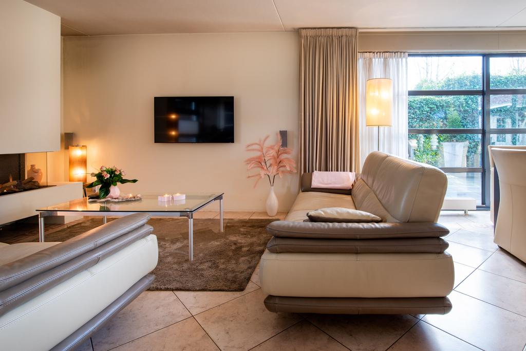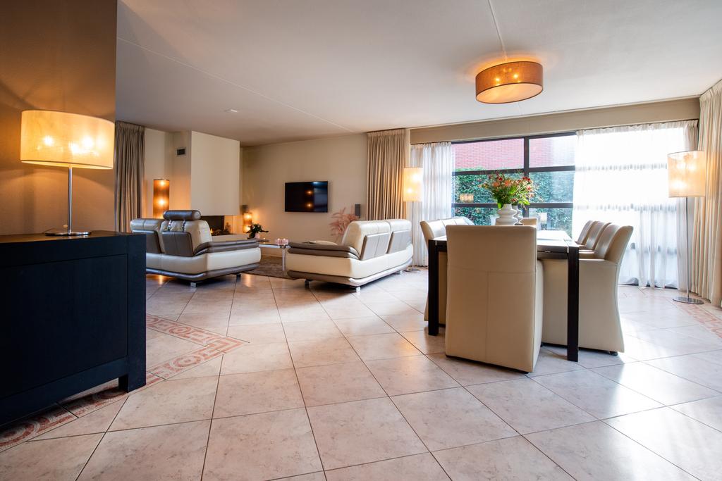Mooie royale woonkamer (groot ca. 47.0 m2) met tegelvloer, gashaard en tweetal separate (dubbel) schuifpui naar achter-/zijtuin en buitenterras.