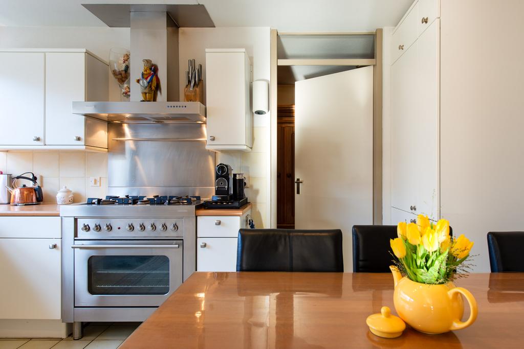 Ruime woonkeuken (groot ca. 14.0 m2) voorzien van tuindeur en tegelvloer alsmede keurig nette inrichting met diverse vaste kastruimte en inbouwapparatuur.