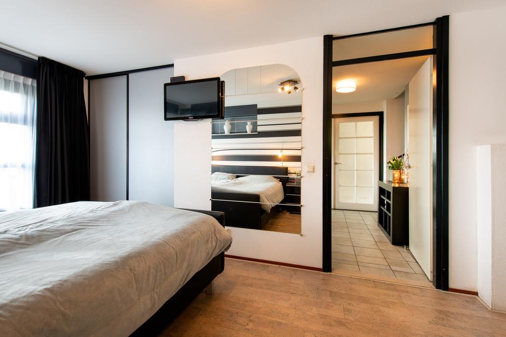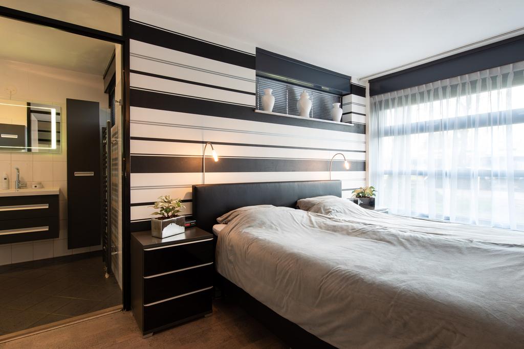 Slaapkamer (groot ca. 16.0 m2) met laminaatvloer, modern lichte wanden en plafond alsmede tweetal kastwanden.