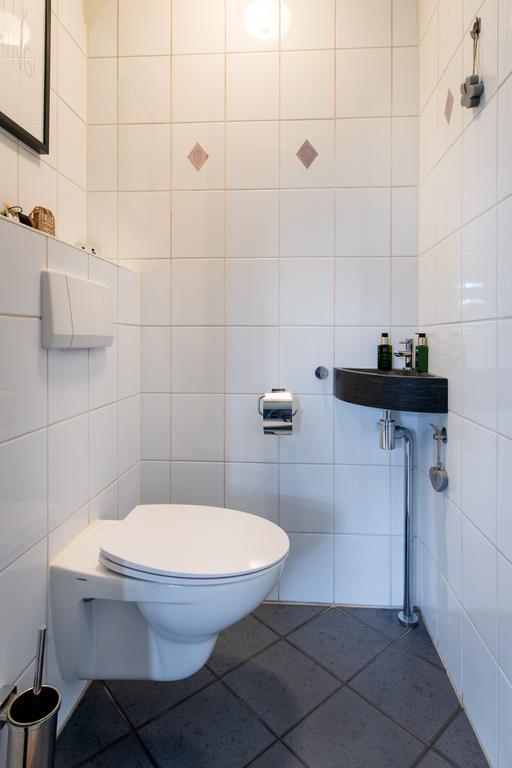 Volledig licht betegelde toiletruimte voorzien van wandcloset en fonteintje.