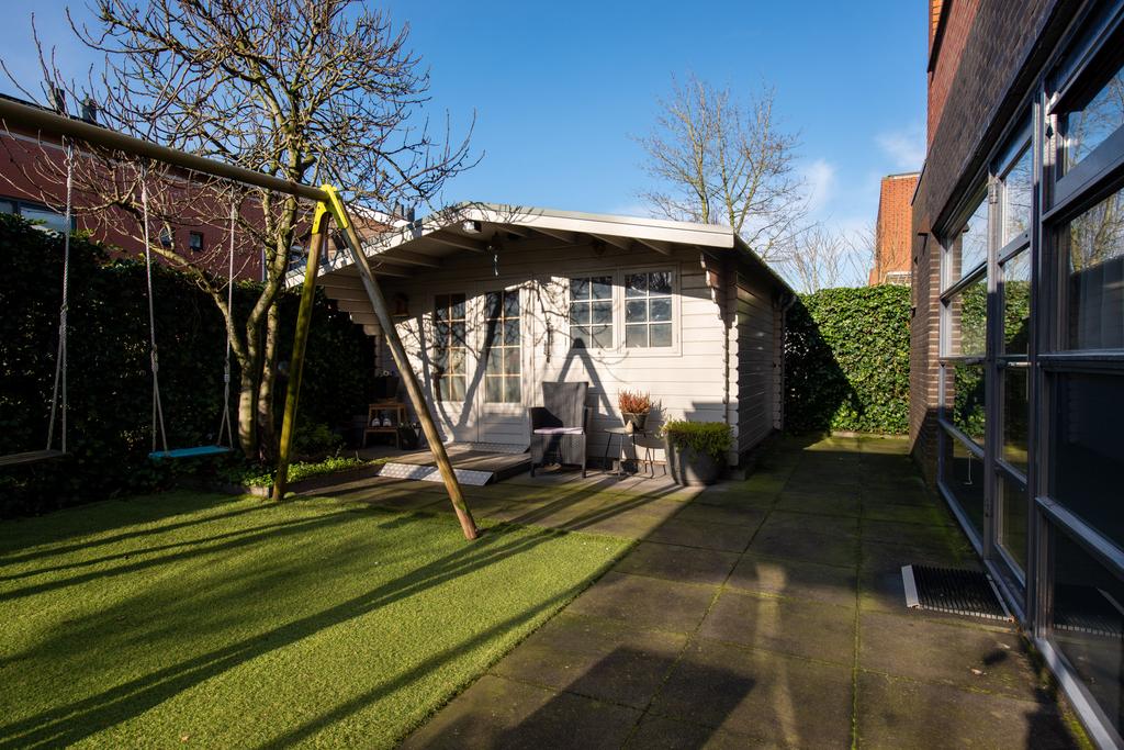 Fraaie en keurig aangelegde achtertuin (onderhoudsarm) op het zuidwesten met o.a.: terras en elektrisch zonnescherm, luxe veranda, chaletberging (ca. 15 m2) en diverse voorzieningen.