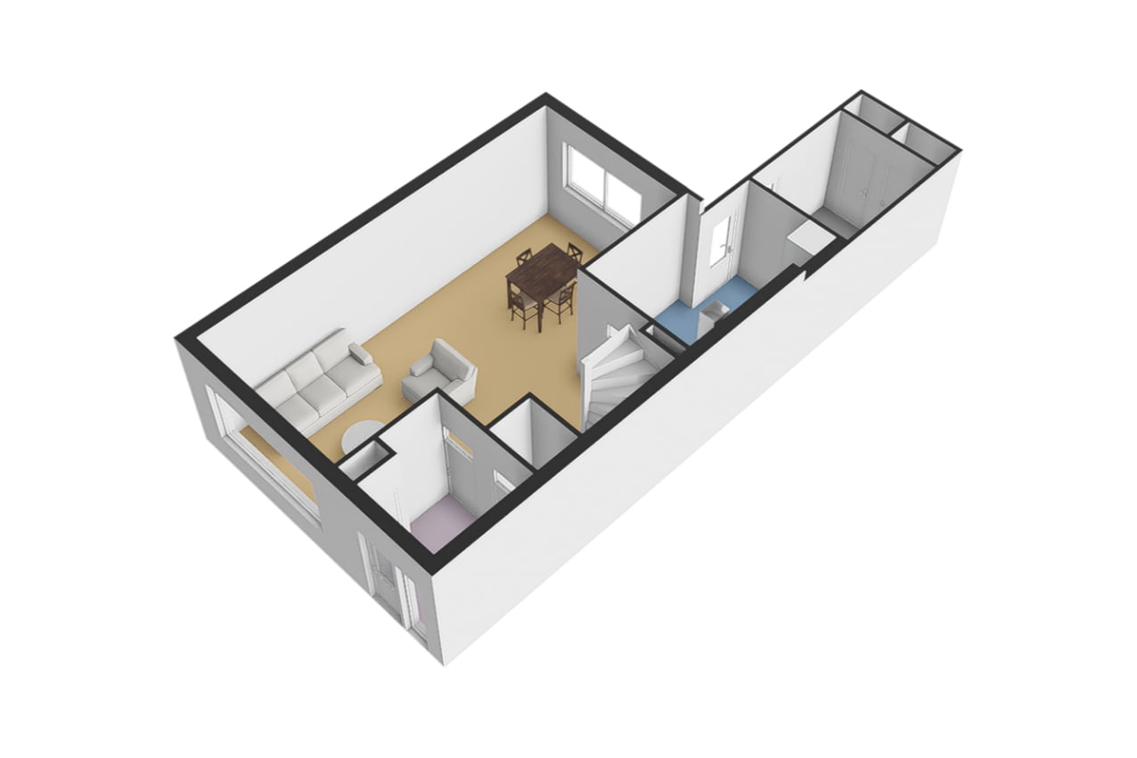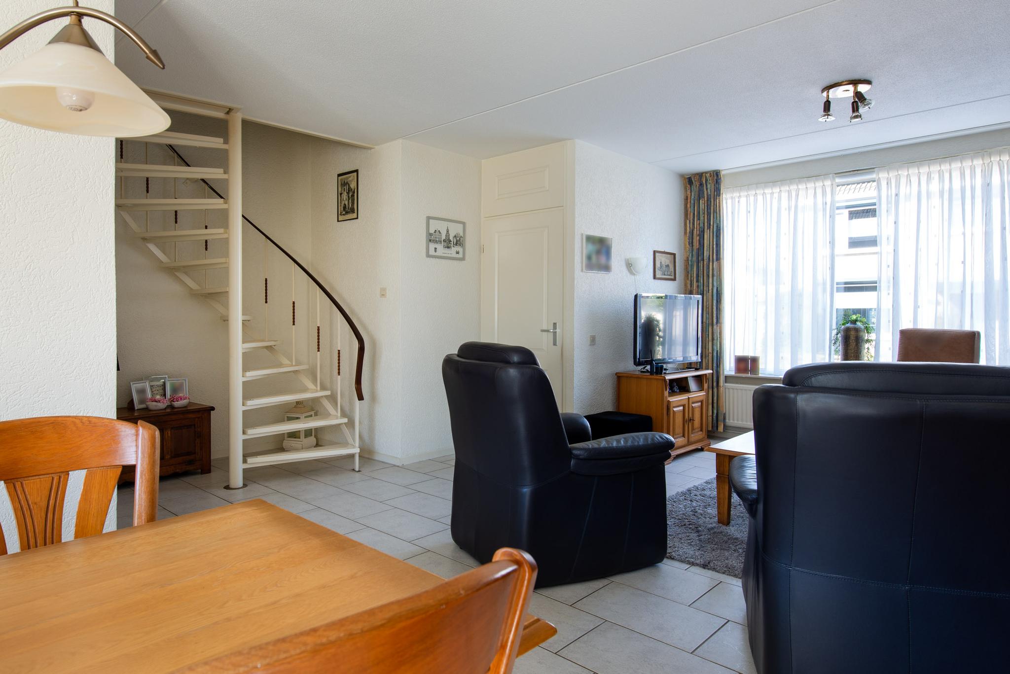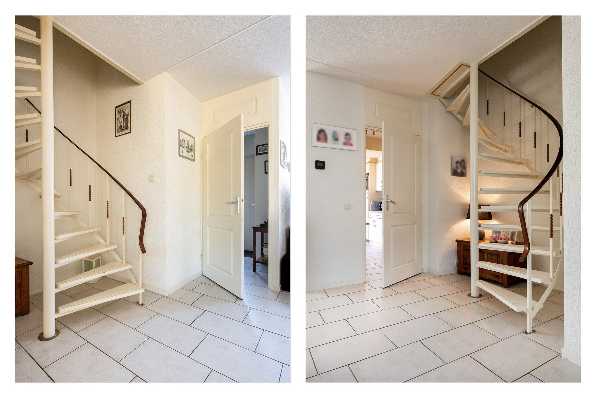 Ruime woonkamer met lichte wand-/plafondafwerking, trapopgang en tegelvloer.