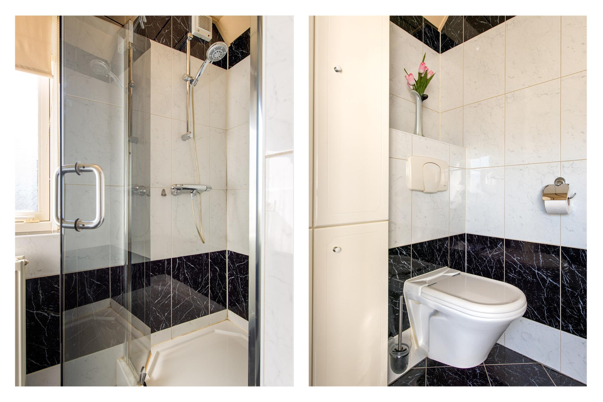 Keurig nette badkamer voorzien van douchecabine en 2e toilet type wandcloset, wastafel en badmeubel.