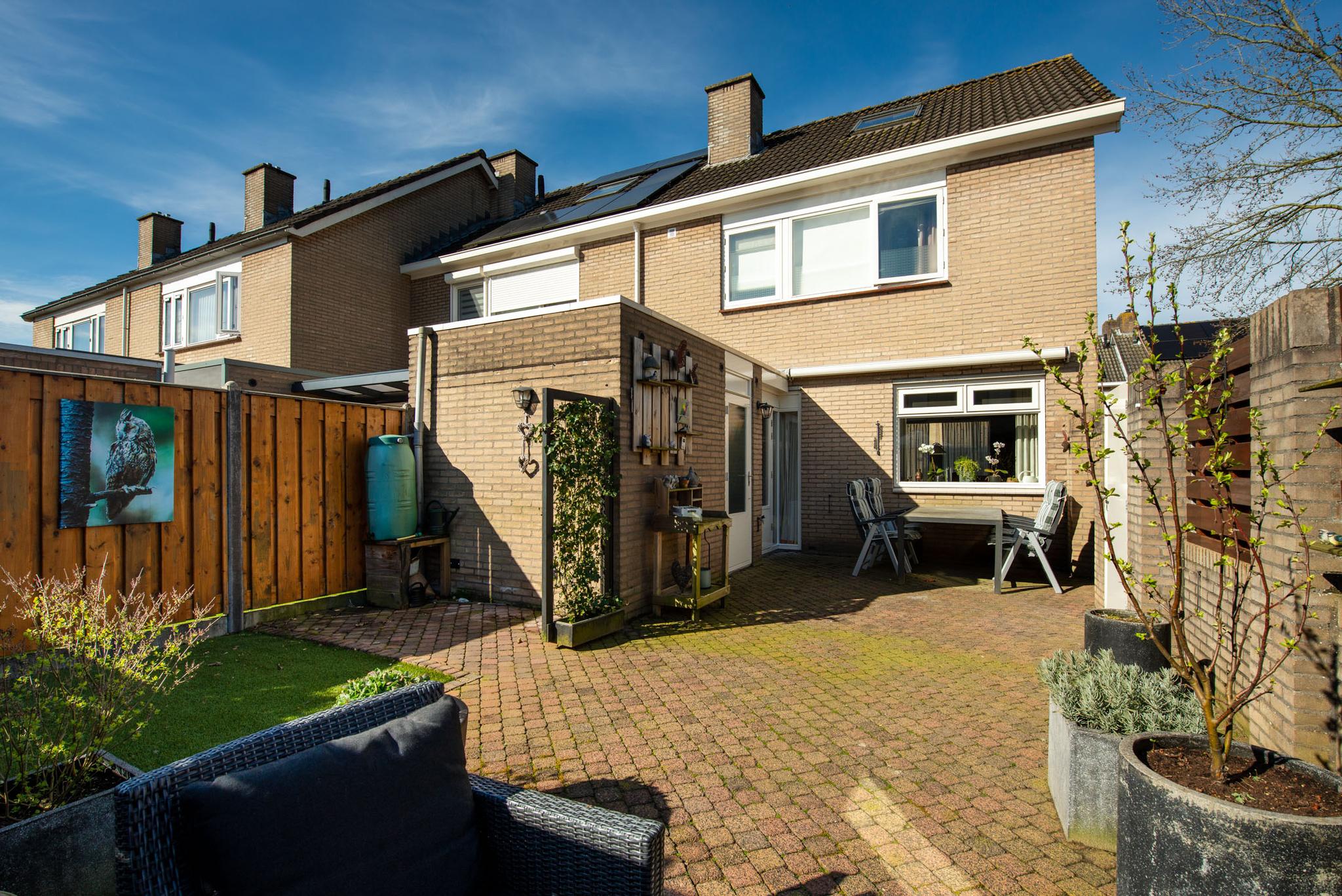 Royale en zonnige achtertuin met o.a: poort achterom, zonterras en zonnescherm, bestrating en keurig nette erfafscheiding.