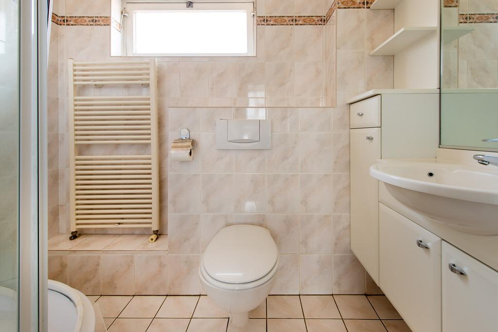 Licht betegelde badkamer met douchecabine en toilet, wastafel en badmeubel.