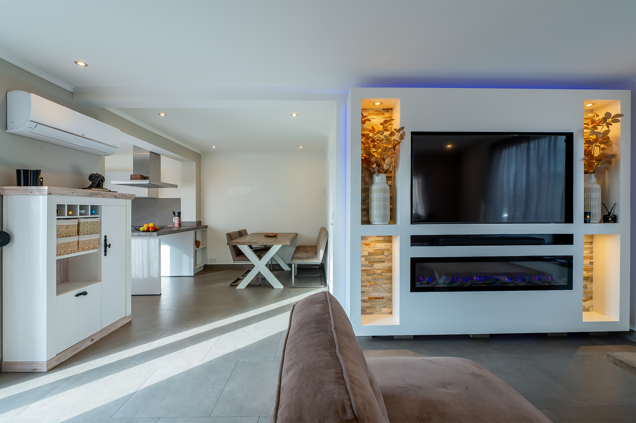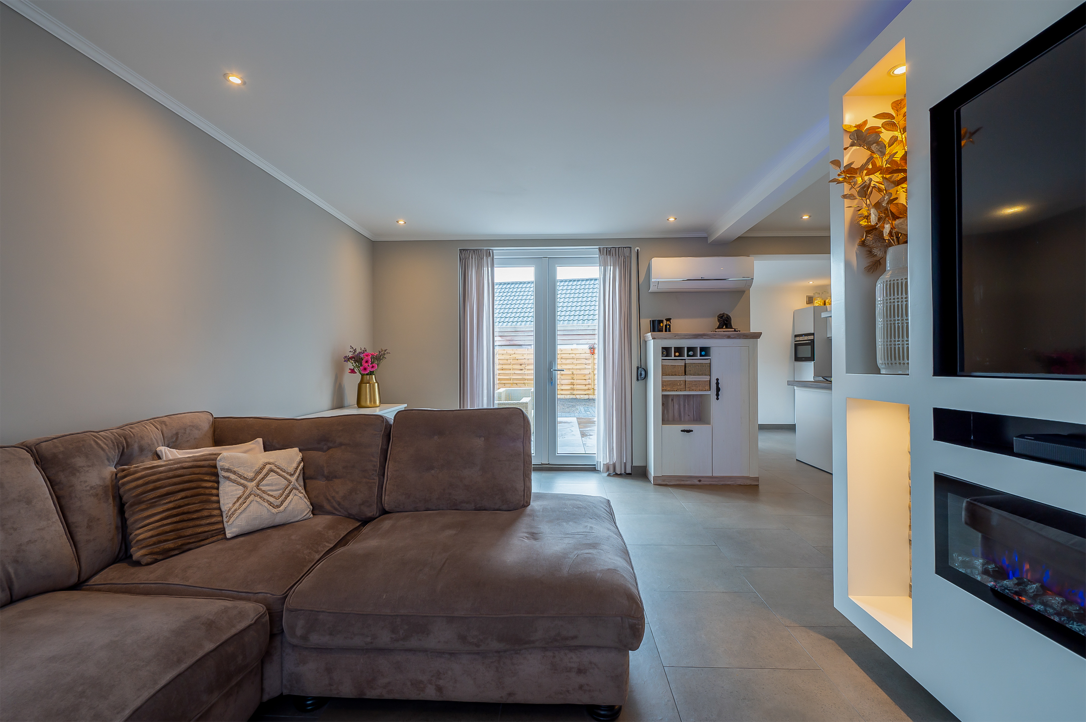 Binnen in de woning treft u een lichte en sfeervolle woonkamer met vloerverwarming en airconditioning op de begane grond.