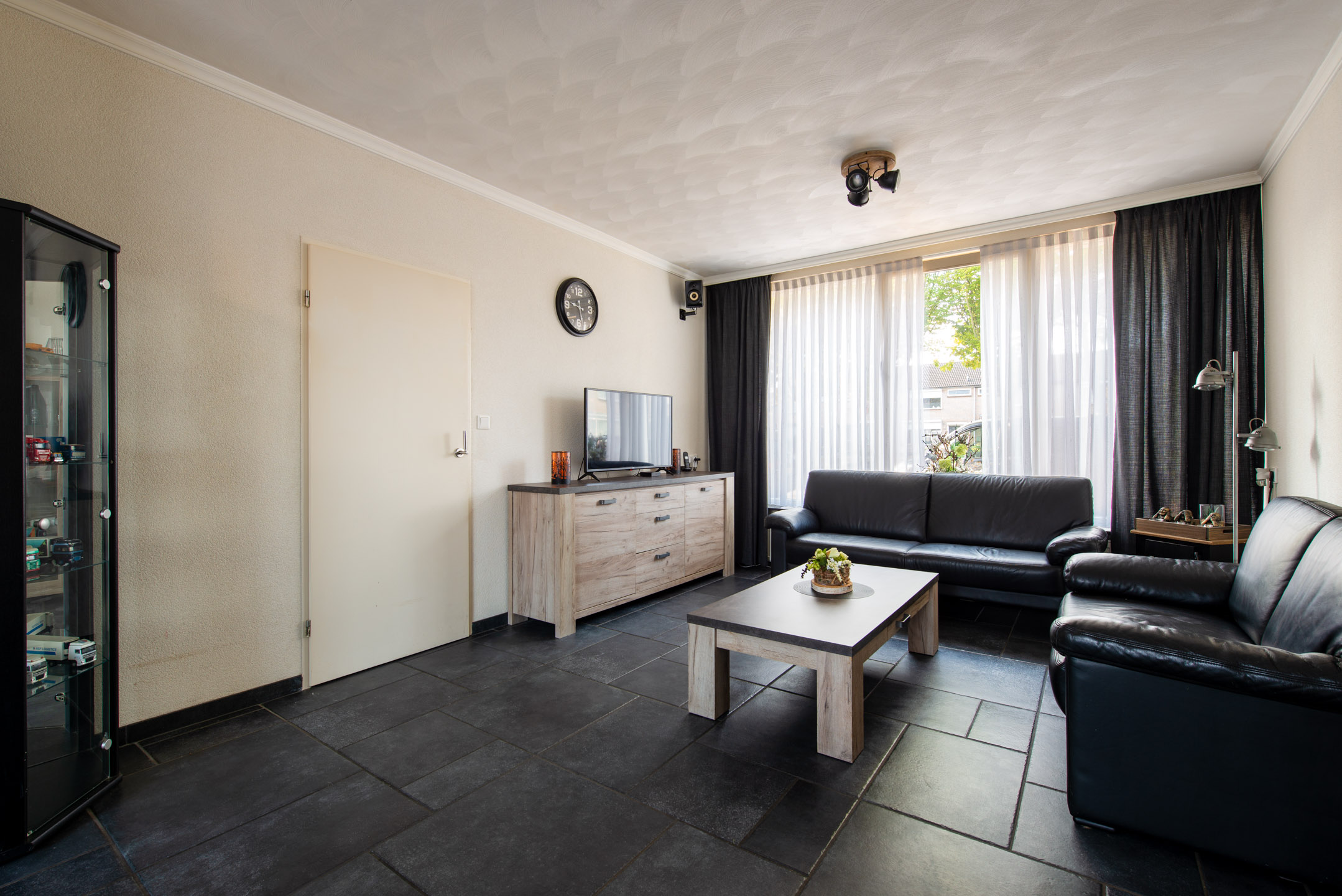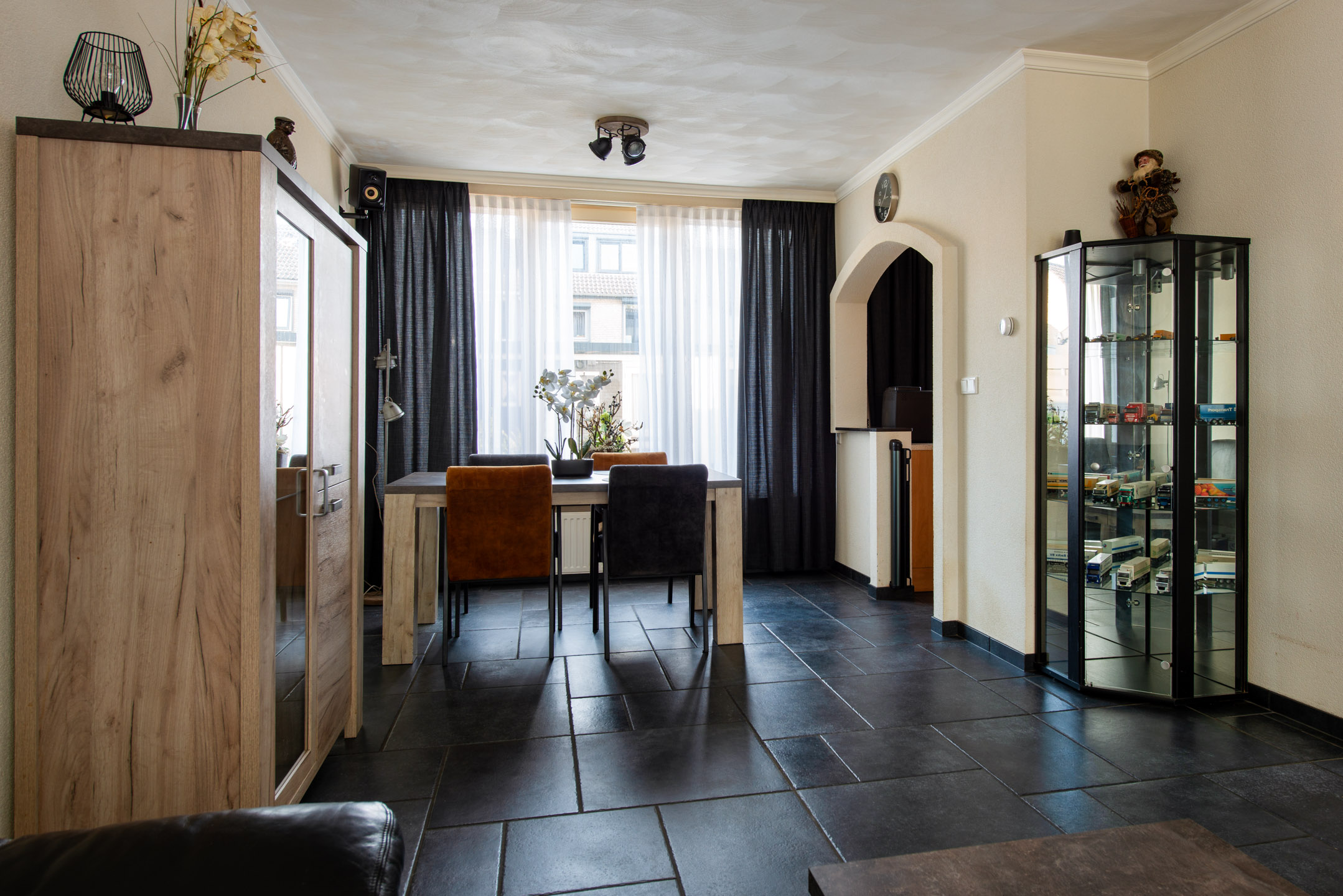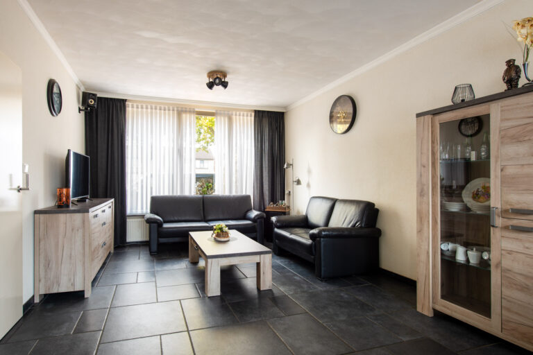 Fijne woonkamer voorzien van nette tegelvloer en vloerverwarming, stucwerk wanden en plafond.