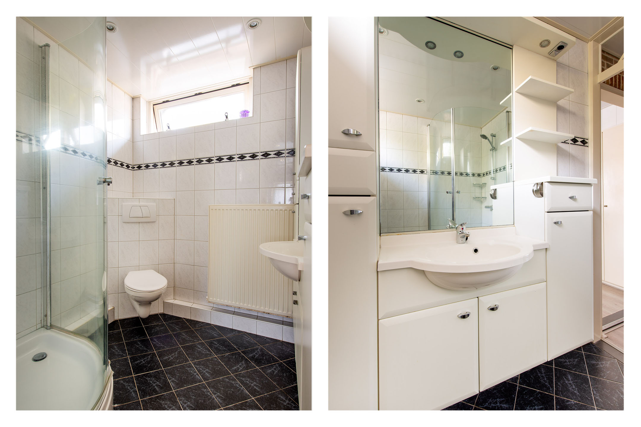 Keurig nette en betegelde badkamer met douchecabine en wastafel, 2e toilet en badmeubel.