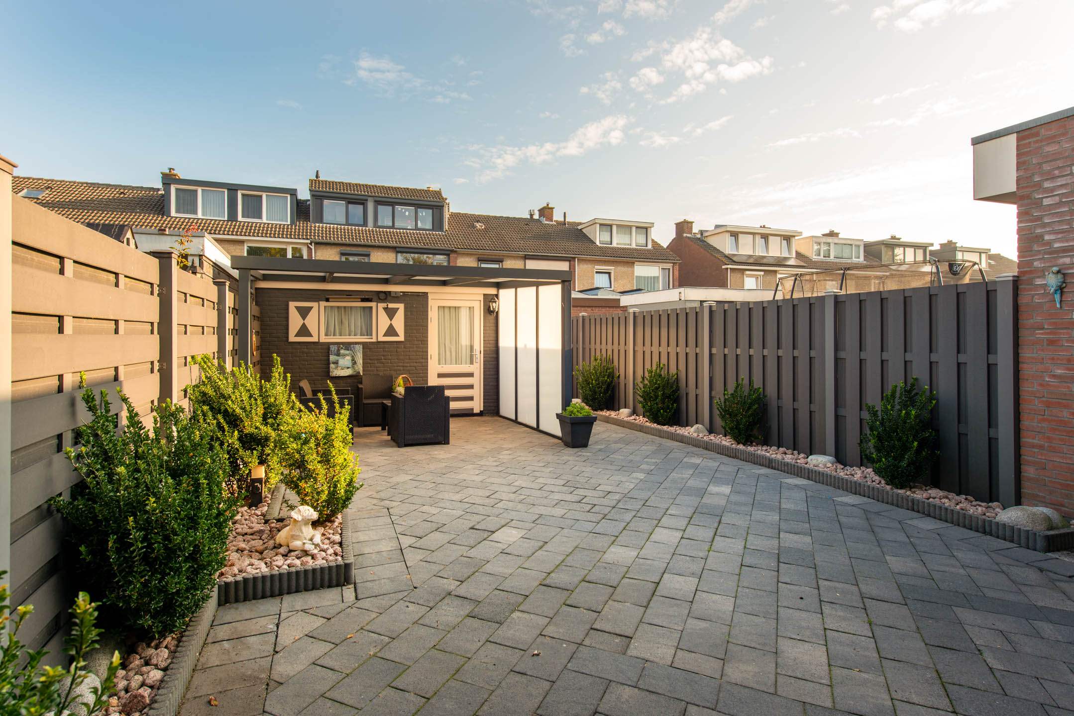 Royale achtertuin voorzien van aluminium overkapping (ca. 12.0 m2), nette erfafscheiding en poort achterom.