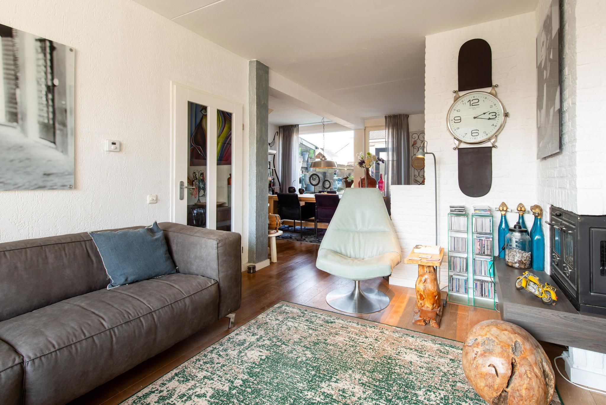 Riante een speels ingedeelde Z-vormige woonkamer (zitkamer/eetkamer) met houten vloer (op beton), haardpartij en licht moderne wanden en plafondafwerking (totaal groot ca. 40 m2!).