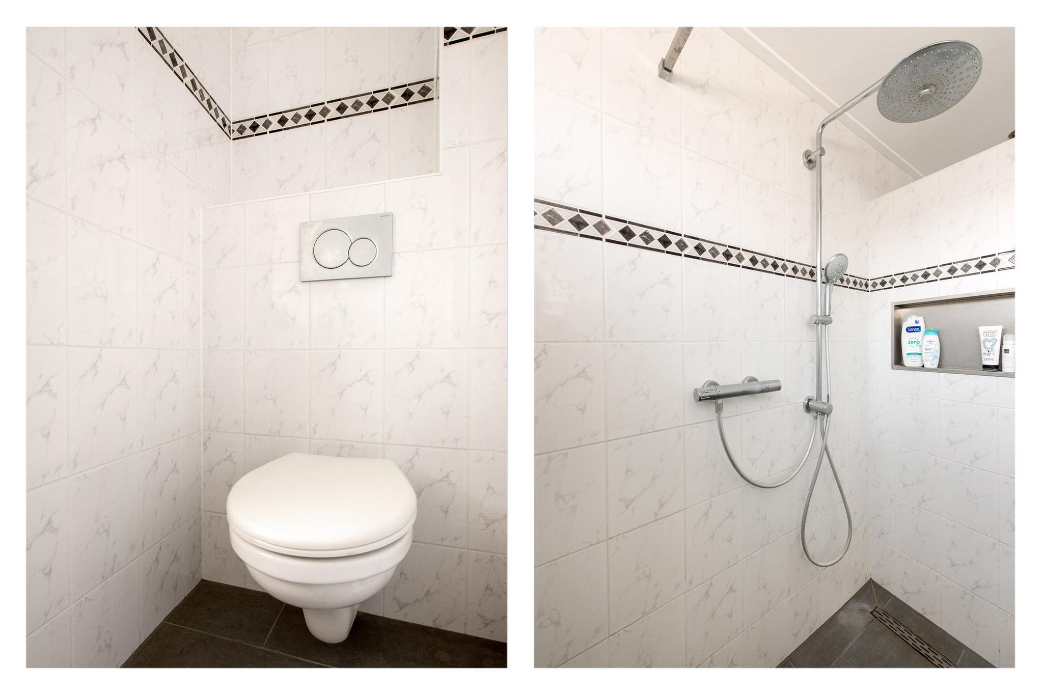Volledig betegelde moderne badkamer voorzien van dubbele wastafel en badmeubel, design radiator, inloopdouche en 2e toilet type wandcloset.