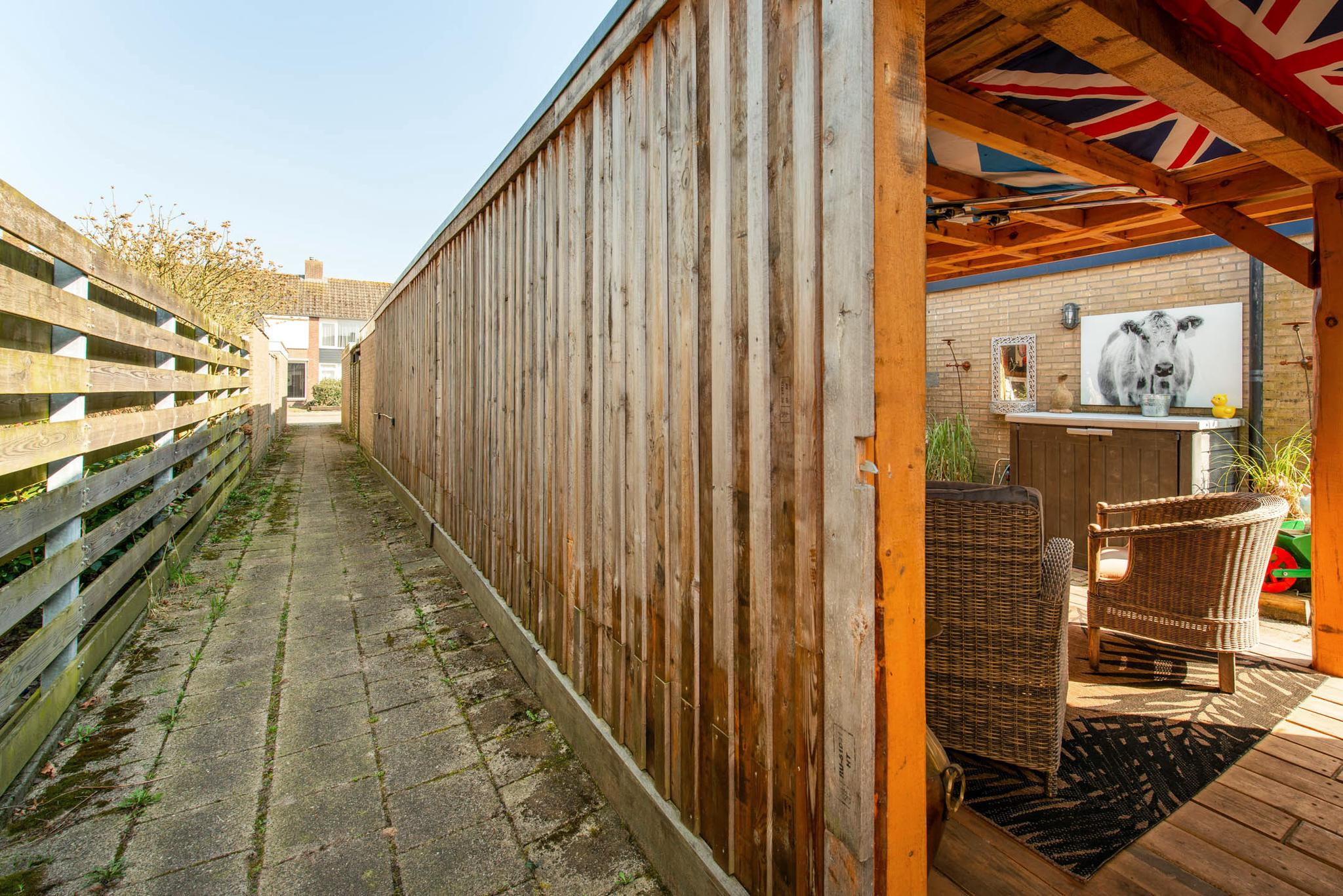 Zonnige achtertuin (op het westen) voorzien van stenen berging (elektra/verlichting) en poort achterom, terras en zonwering.