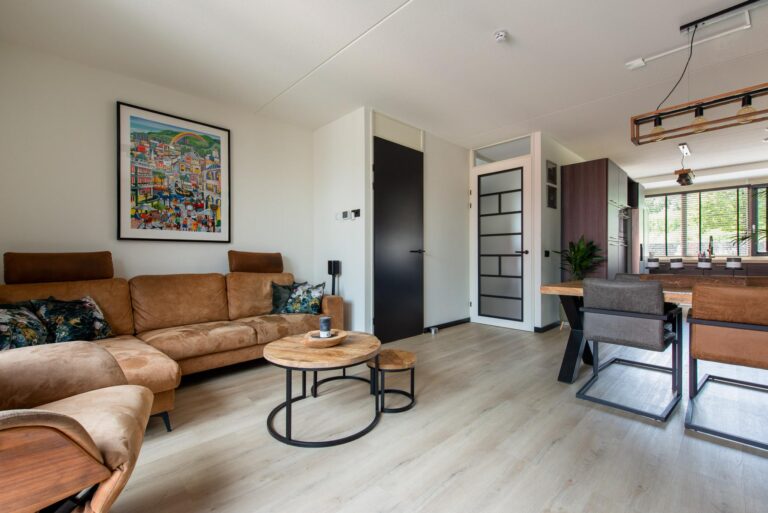 Woonkamer met vaste kast en tuindeur.