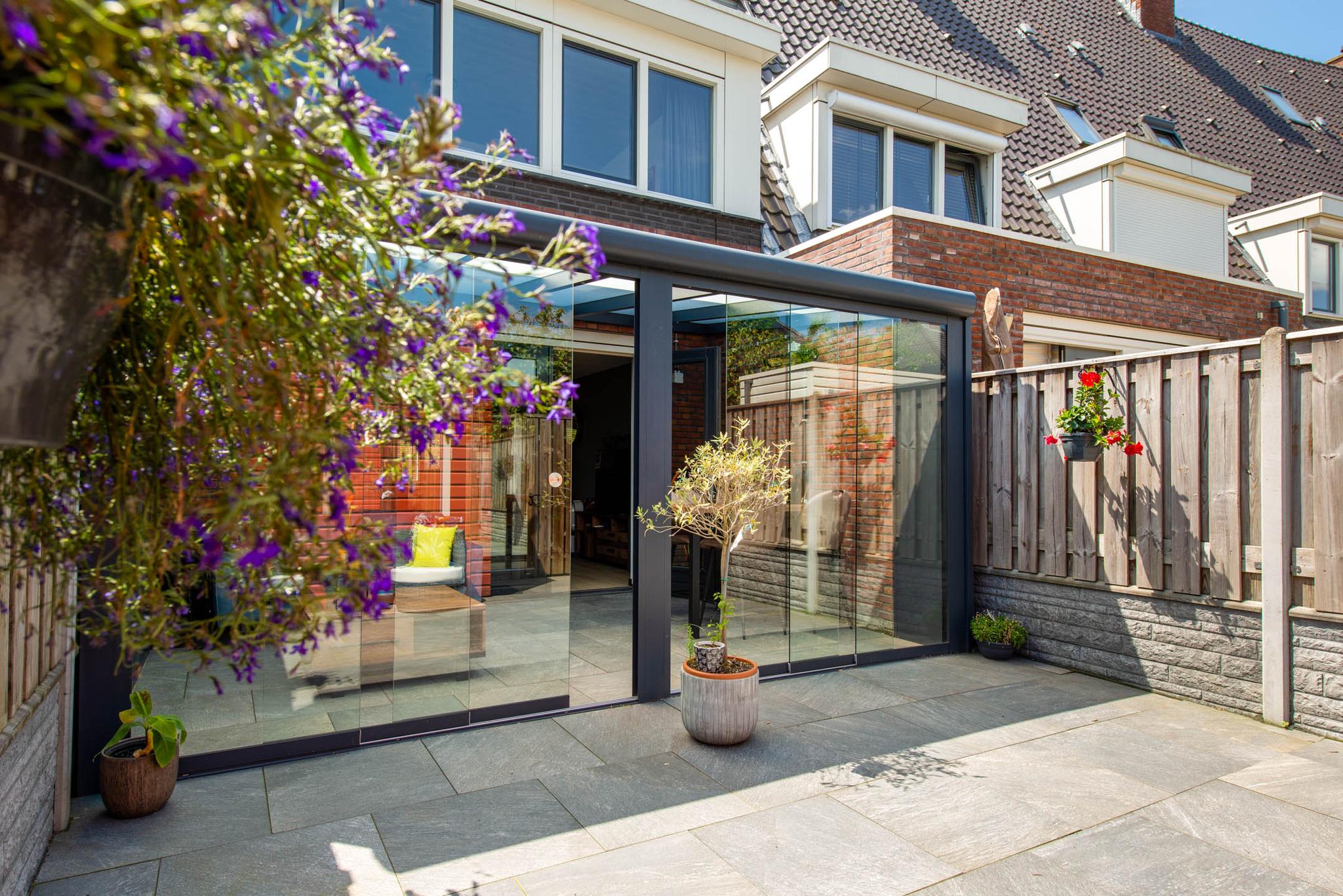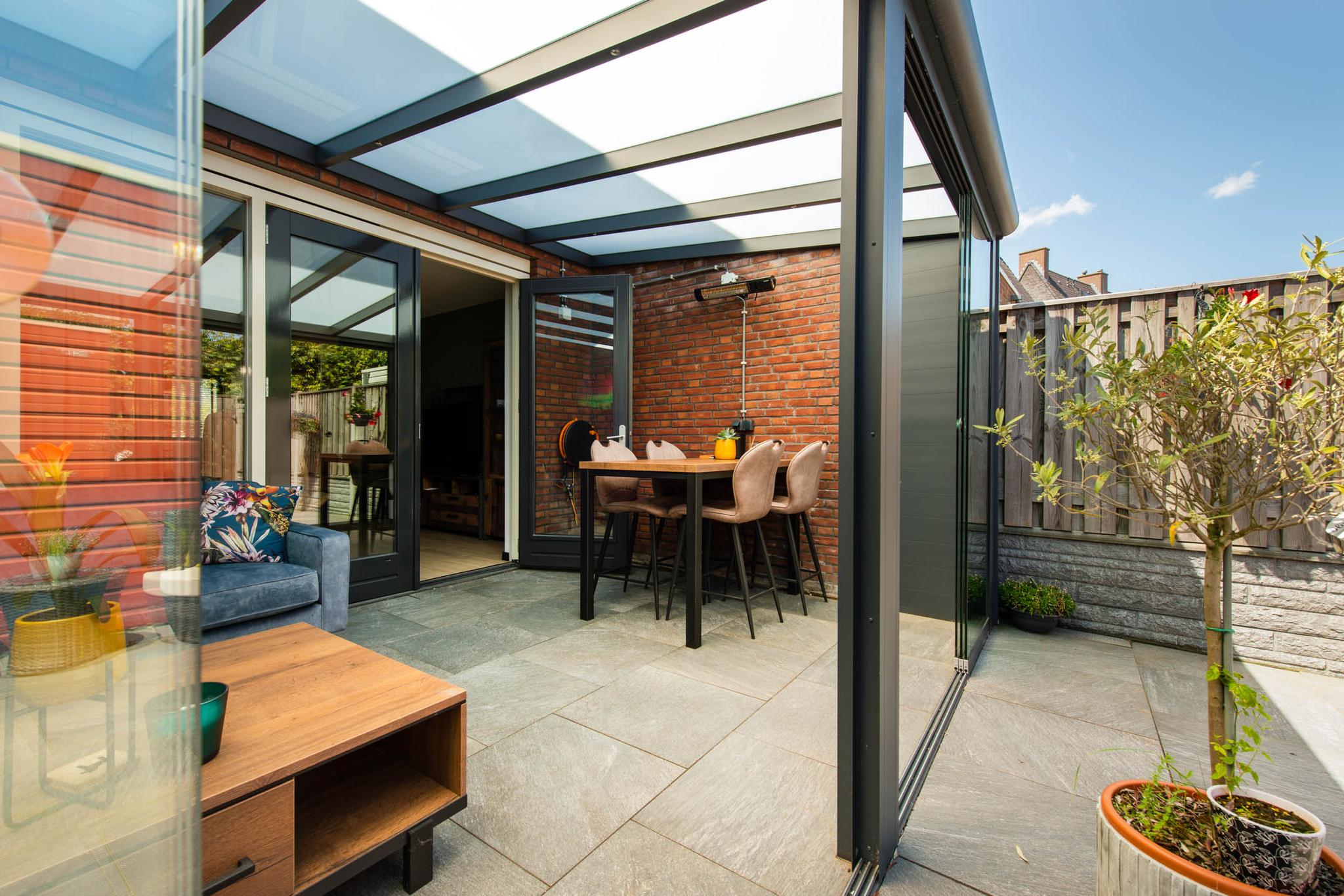 Mooie en luxe aluminium serre voorzien van sfeerverlichting en glazen tuindeuren.